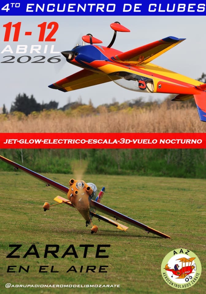 Los días 11 y 12 de abril de 2026 la Asociación Civil de Aerocontrolados Zarate estará realizando su 4to encuentro de clubes. La misma se desarrollará en nuestro campo de vuelo situado en el aeródromo de Zarate, calle España s/n, Zarate.
